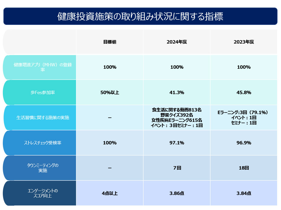 | 歩FESウォーキングイベント | 「MY HEALTH WEB」のスマートフォンアプリを利用したウォーキング大会 | 全社員 | 468名 |